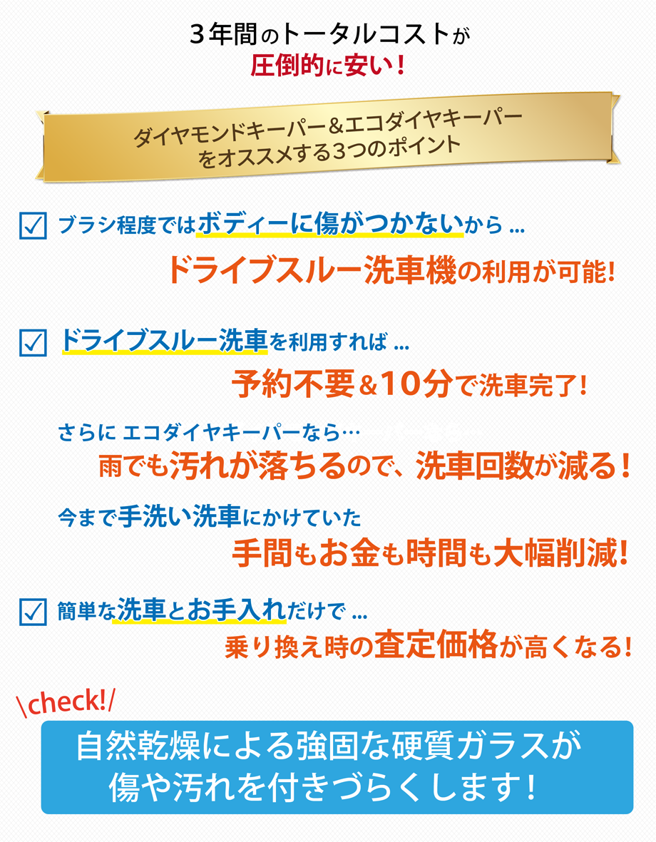 エコダイヤキーパーを施工してもらいました。野外駐車場で洗車に苦労していましたが、水洗い一拭きで綺麗になるのでとても満足しています。