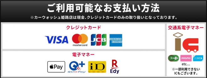 ※カーウォッシュ姫路店は現金、クレジットカードのみの取り扱いとなっております。